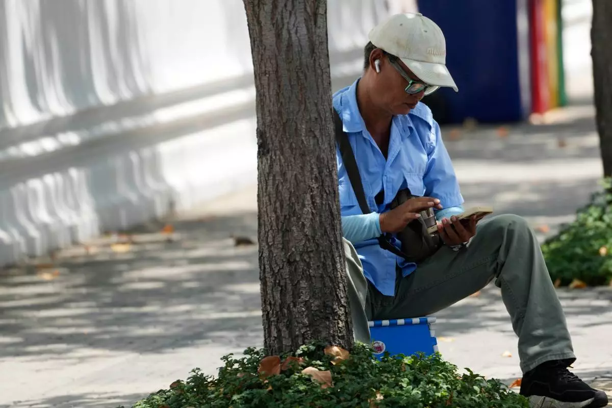 A man checks his mobile phone in Bangkok, Thailand, Wednesday, Aug. 20, 2025. (AP Photo/Sakchai Lalit)