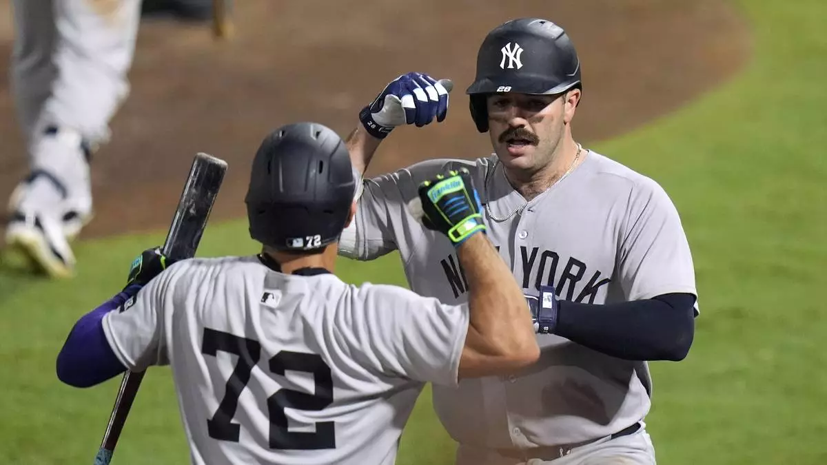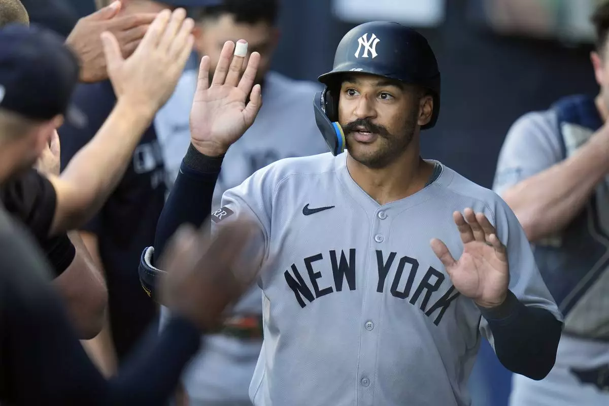 New York Yankees' Trent Grisham celebrates with teammates in the dugout after his solo home run. off Tampa Bay Rays pitcher Drew Rasmussen during the first inning of a baseball game Wednesday, Aug. 20, 2025, in Tampa, Fla. (AP Photo/Chris O'Meara)