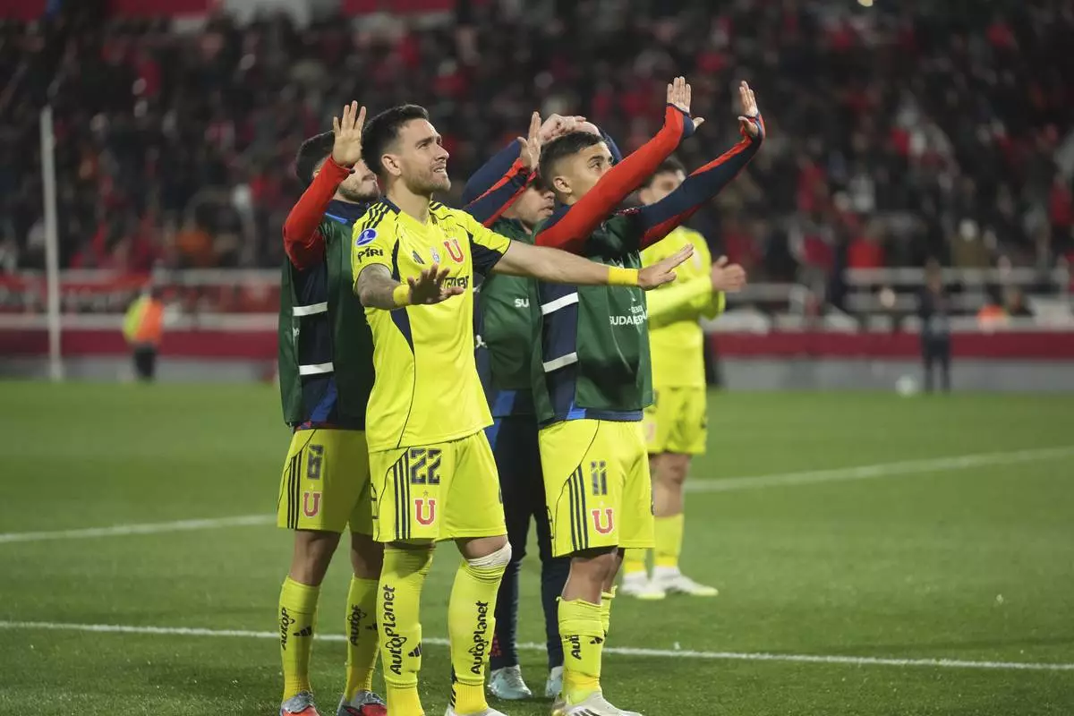 Players of Universidad de Chile try to calm down their fans during a Copa Sudamericana round of sixteen second leg soccer match against Argentina's Independiente at the Libertadores de America stadium in Avellaneda, Argentina, Wednesday, Aug. 20, 2025. (AP Photo/Gustavo Garello)