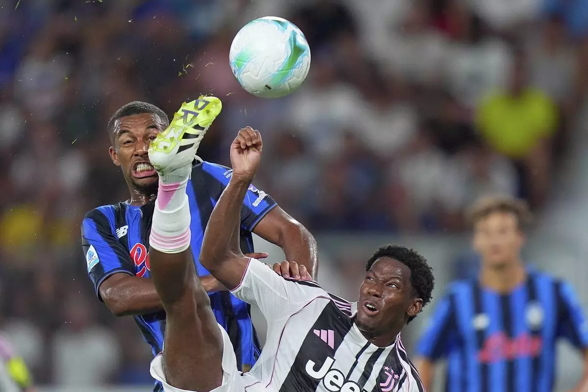 Juventus' Jonathan David, front, scores during the Bortolotti trophy soccer match between Atalanta and Juventus, Saturday , Aug, 16, 2025, at Gewiss Stadium in Bergamo, Italy. (Spada/LaPresse via AP)
