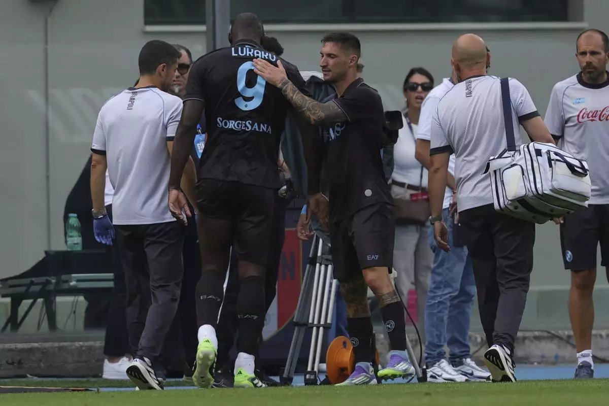 Napoli's Romelu Lukaku is taken out after an injury during a friendly soccer match between Napoli and Olympiakos at the Teofilo Patini Stadium in Castel Di Sangro, Italy, Thursday, Aug. 14 , 2025. (Alessandro Garofalo/LaPresse via AP)