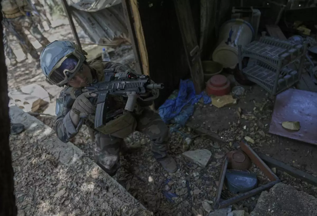 A French U.N. peacekeeper takes position as he enters a damaged room once used by Hezbollah fighters in the Saluki Valley, south Lebanon, Wednesday, Aug. 20, 2025. (AP Photo/Hussein Malla)