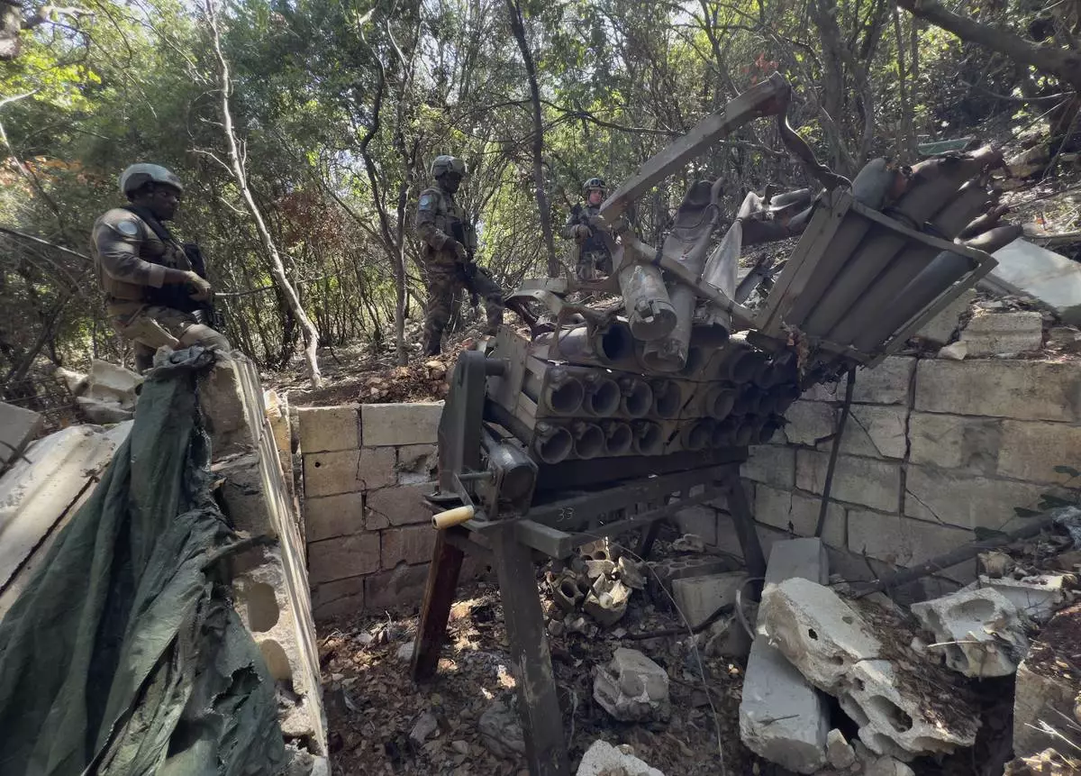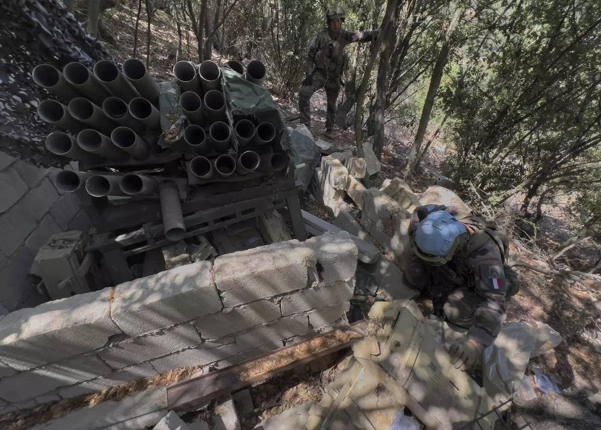 A French U.N. peacekeeper, foreground, checks ammunition boxes next to a destroyed Hezbollah rocket launcher in the Saluki Valley, south Lebanon, Wednesday, Aug. 20, 2025. (AP Photo/Hussein Malla)