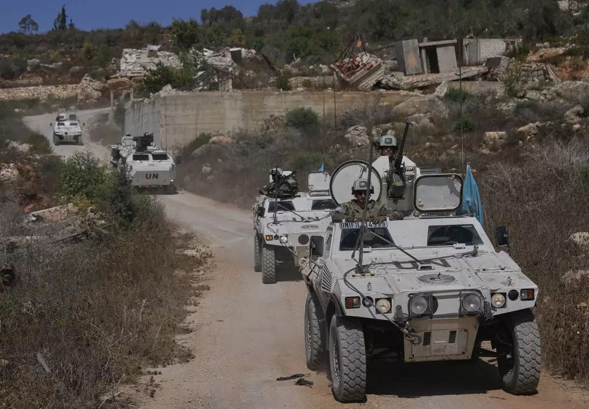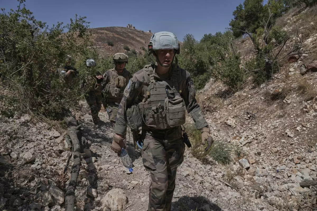 French U.N. peacekeepers patrol along the Lebanese-Israeli border in Kfra Kila village, south Lebanon, Wednesday, Aug. 20, 2025. (AP Photo/Hussein Malla)