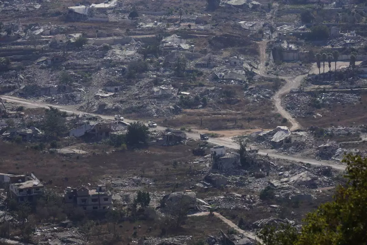 U.N. vehicles drive through destruction near the Lebanese-Israeli border in the village of Kfra Kila, southern Lebanon, Wednesday, Aug. 20, 2025. (AP Photo/Hussein Malla)