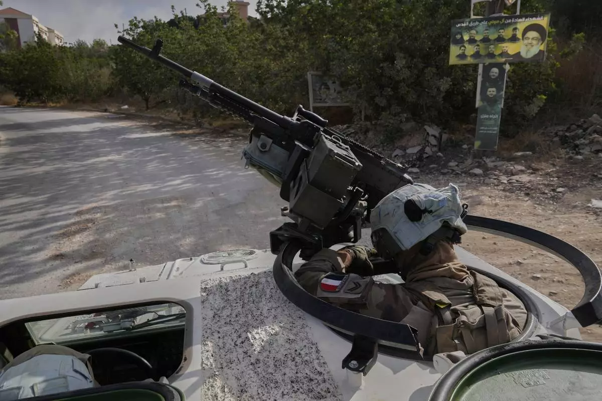 A French U.N. peacekeeper rides on an armored vehicle during a patrol along the Lebanese-Israeli border in the village of Kfra Kila, southern Lebanon, Wednesday, Aug. 20, 2025. (AP Photo/Hussein Malla)