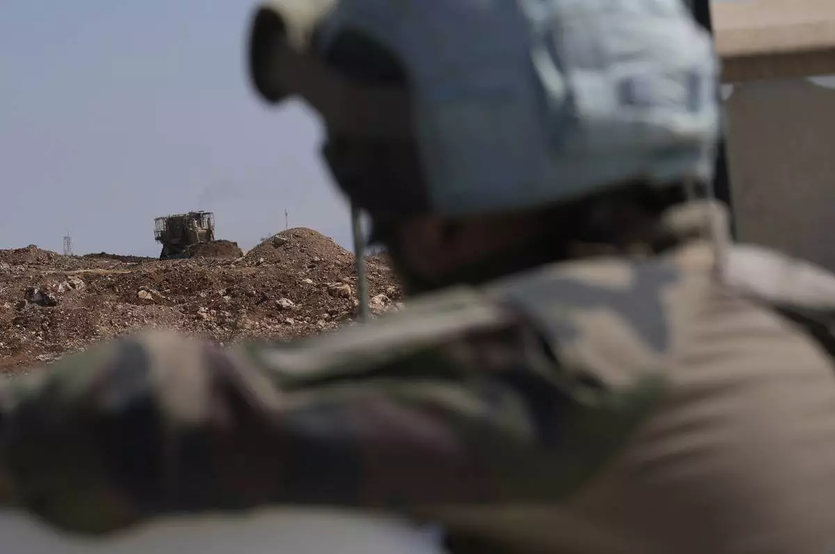 A French U.N. peacekeeper, foreground, watches an Israeli bulldozer building a sand barrier at one of five new Israeli army positions along the road between Houla and Kfar Kila, southern Lebanon, Wednesday, Aug. 20, 2025, following airstrikes and a ground offensive that destroyed nearby villages. (AP Photo/Hussein Malla)