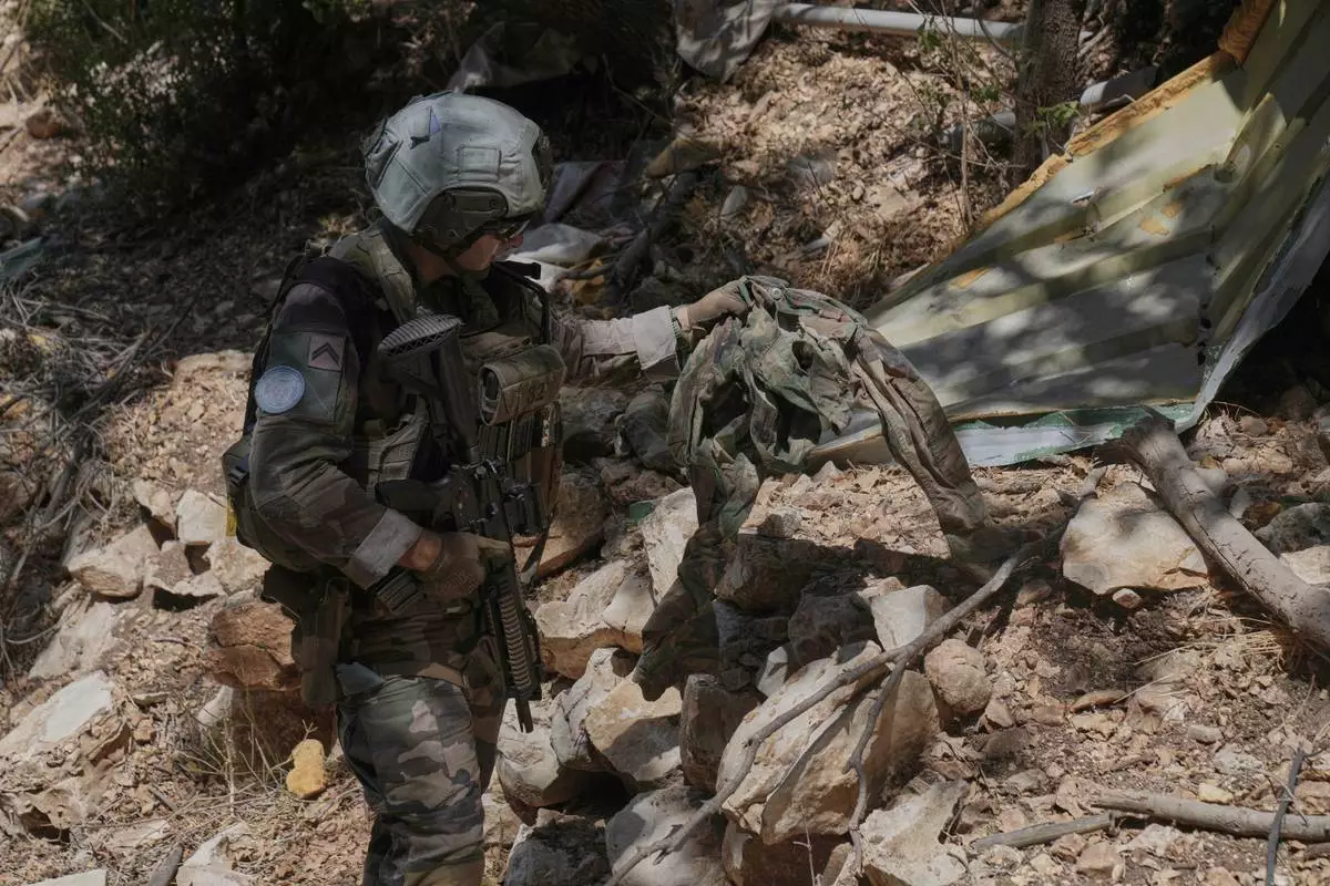 A French U.N. peacekeeper examines a destroyed position Hezbollah in the Saluki Valley, southern Lebanon, Wednesday, Aug. 20, 2025. (AP Photo/Hussein Malla)