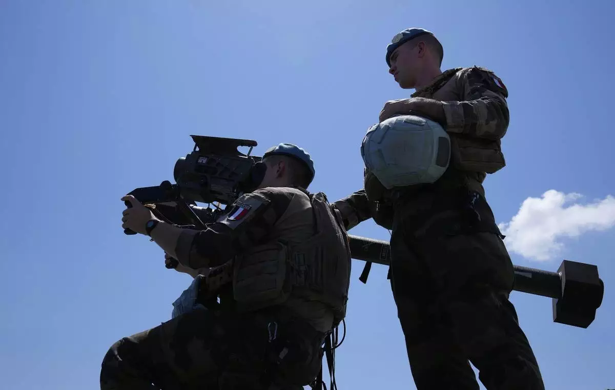 French U.N. peacekeepers use a Mistral air-defense system while inspecting their base in Deir Kifa, southern Lebanon, Wednesday, Aug. 20, 2025. (AP Photo/Hussein Malla)