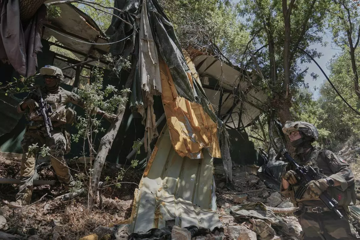 French U.N. peacekeepers inspect a destroyed Hezbollah position in the Saluki Valley, southern Lebanon, Wednesday, Aug. 20, 2025. (AP Photo/Hussein Malla)