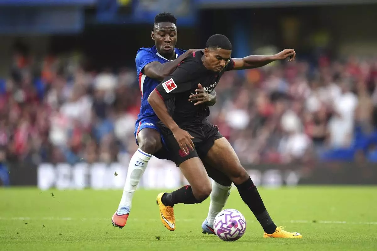 Chelsea's Dario Eussugo, left, and Bayer Leverkusen's Amine Adli in action during the pre-season friendly match between Chelsea and Bayer 04 Leverkusen at Stamford Bridge, London, Friday Aug. 8, 2025. (Adam Davy/PA via AP)