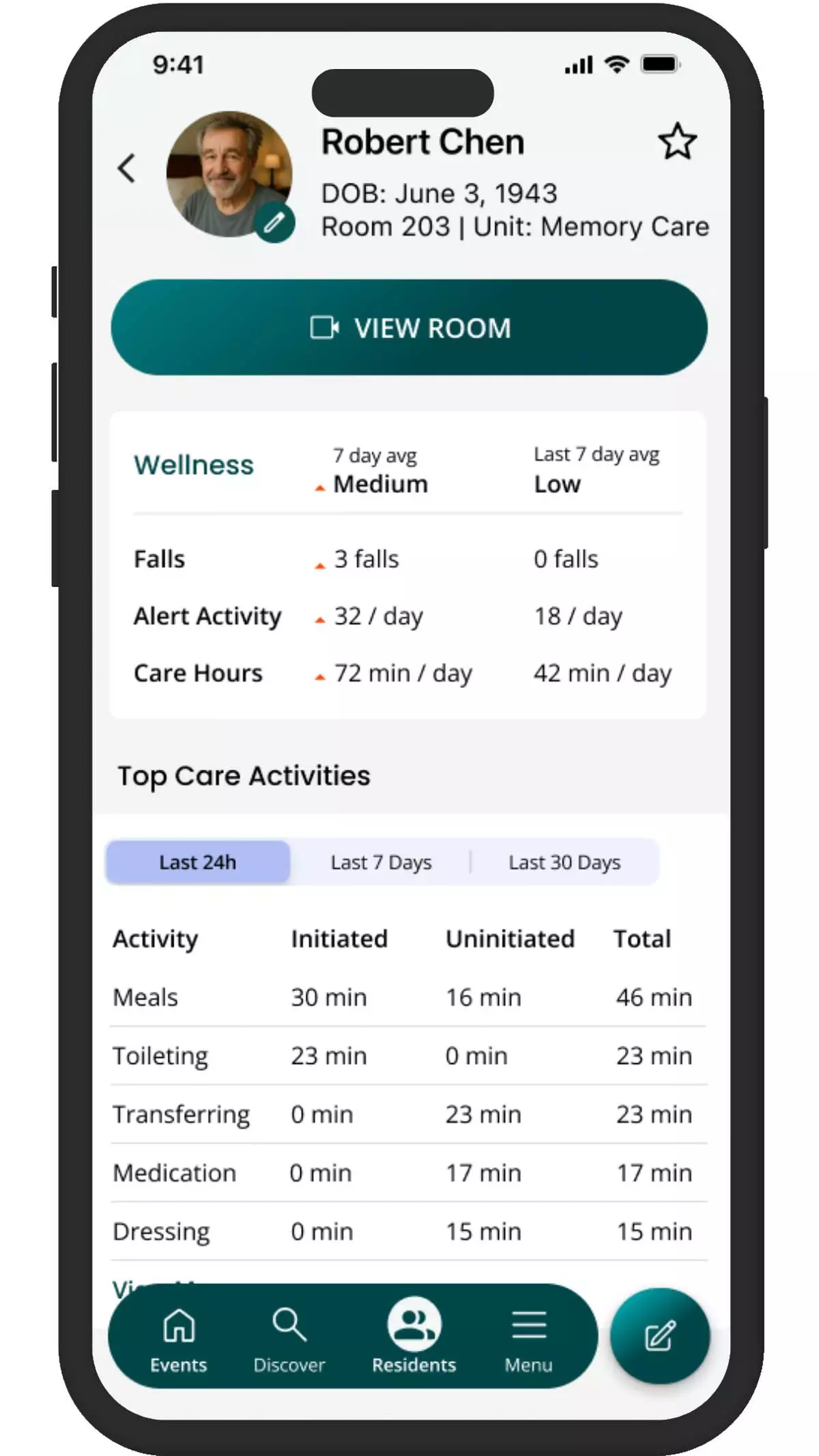 Rich resident wellness data so communities can update care plans sooner, have data-driven family conversations with greater insight into well-being, and deliver higher-quality care with improved outcomes for residents.