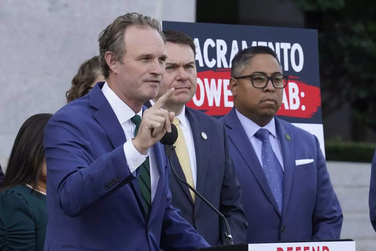 California state Assembly Republican leader James Gallagher of Yuba City, left, speaks against a package of measures to redraw the state's Congressional districts and put new maps before voters in a special election, during a news conference in Sacramento, Calif., Thursday, Aug. 21, 2025. (AP Photo/Rich Pedroncelli)