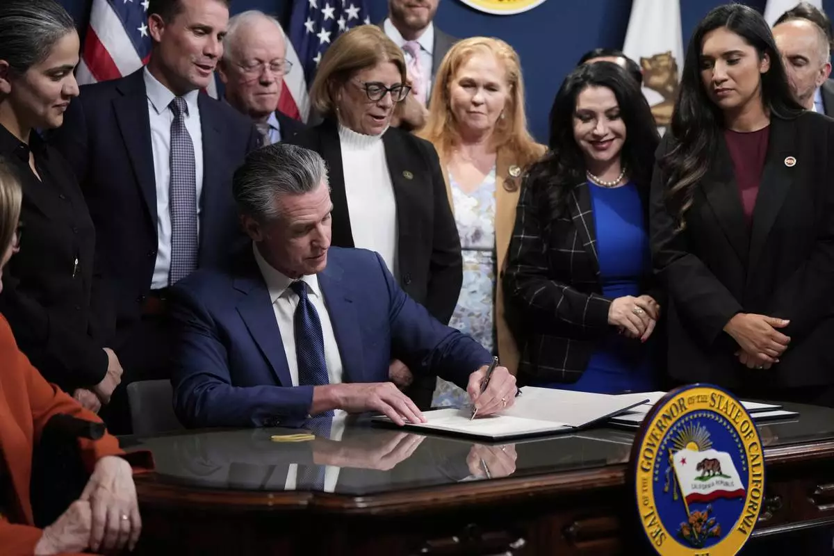 California Gov. Gavin Newsom signs legislation calling for a special election on a redrawn congressional map on Thursday, Aug. 21, 2025, in Sacramento, Calif. (AP Photo/Godofredo A. Vásquez)