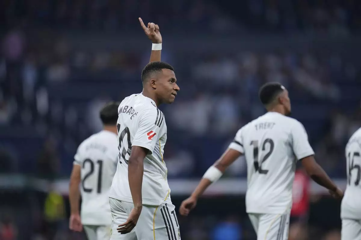 Real Madrid's Kylian Mbappe celebrates after scoring from a penalty kick during the La Liga soccer match between Real Madrid and Osasuna in Madrid, Spain, Tuesday, Aug. 19, 2025. (AP Photo/Manu Fernandez)