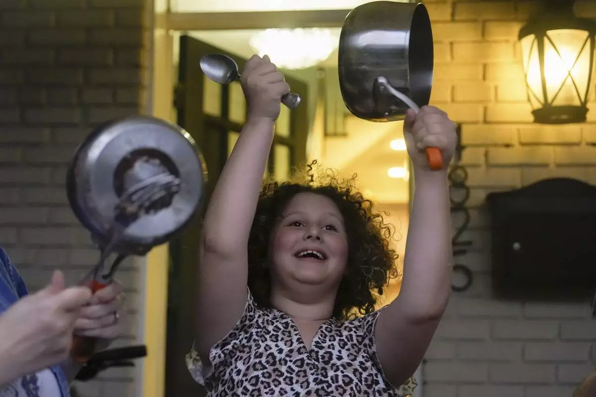 Joan Ratner bangs a pot on her porch in protest of President Donald Trump's use of federal law enforcement and National Guard troops in Washington, Wednesday, Aug. 20, 2025, in Washington. (AP Photo/Julia Demaree Nikhinson)