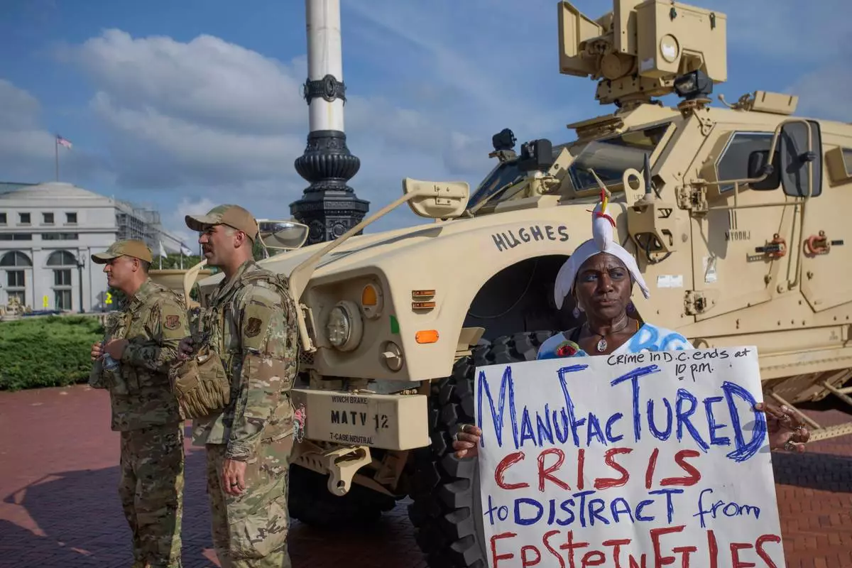 Protester Nadine Seiler holds her sign near National Guard members from the 167th Security Forces from West Virginia, outside Union Station in Washington, Wednesday, Aug. 20, 2025. (AP Photo/Rod Lamkey, Jr.)