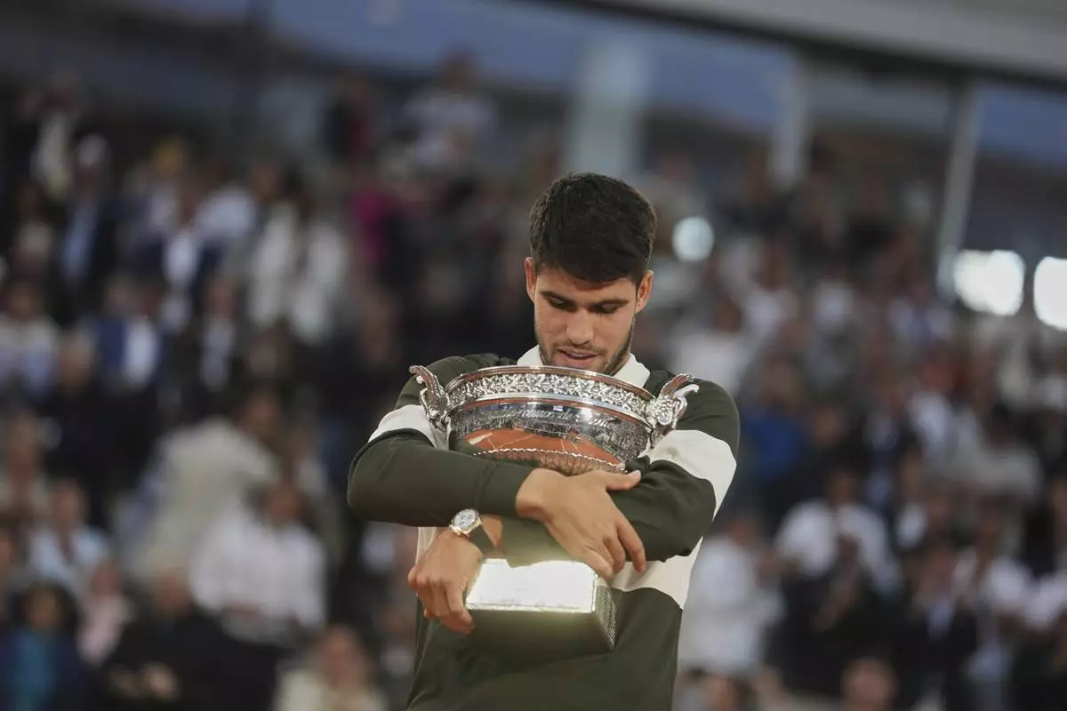 FILE - Spain's Carlos Alcaraz celebrates with the trophy after winning the final match of the French Tennis Open against Italy's Jannik Sinner at the Roland-Garros stadium in Paris, June 8, 2025. (AP Photo/Thibault Camus, File)