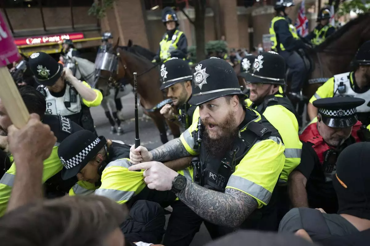 Mounted police officers scuffle with demonstrators during a protest by anti-migrant Abolish Asylum System and counter protesters at Castle Park in Bristol, England, Saturday, Aug. 23, 2025. (Ben Birchall/PA via AP)