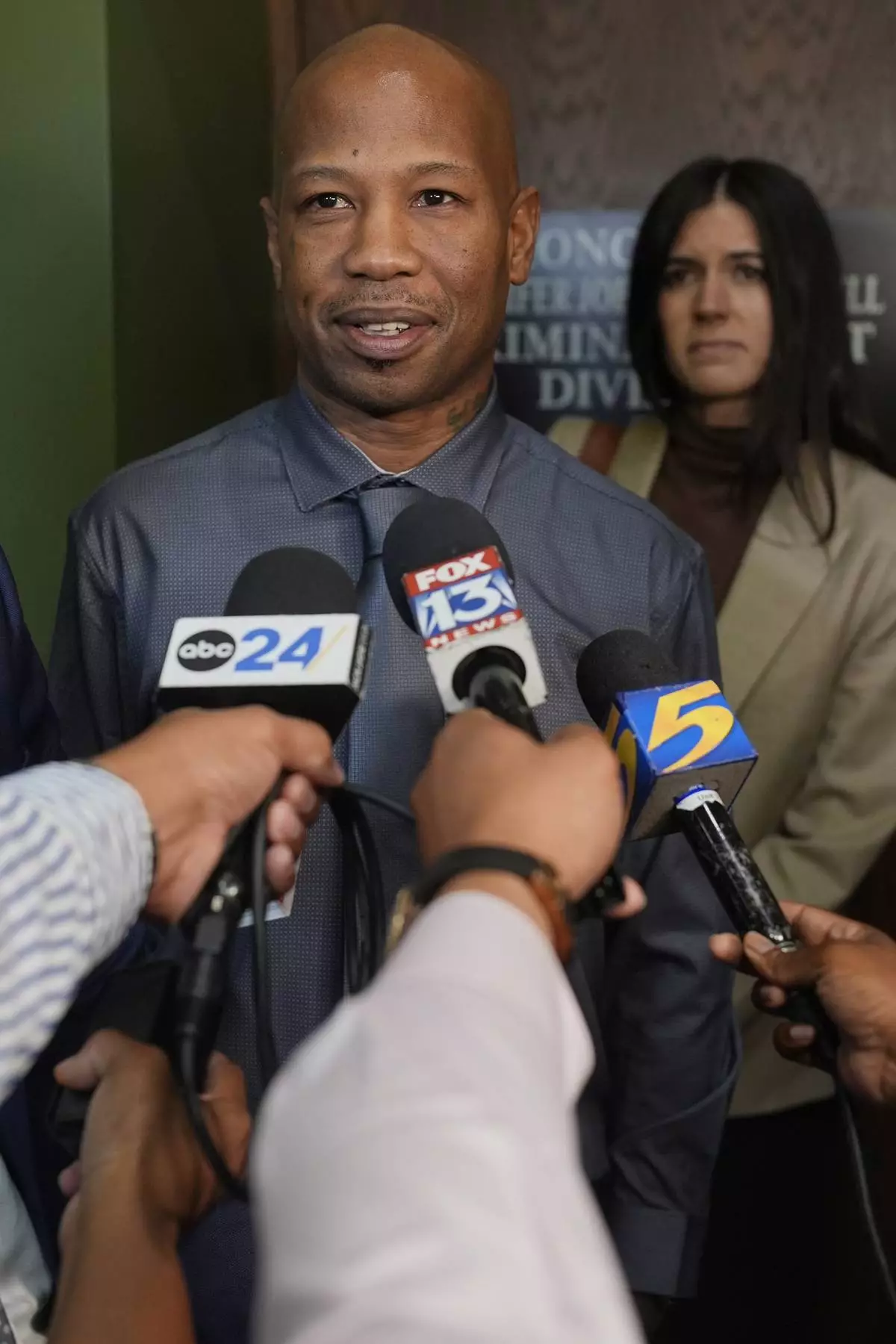 Hernandez Govan, who was accused of orchestrating the killing of rapper Young Dolph, speaks during a news conference after being acquitted on all charges in his trial, Thursday, Aug. 21, 2025, in Memphis, Tenn. (AP Photo/George Walker IV)