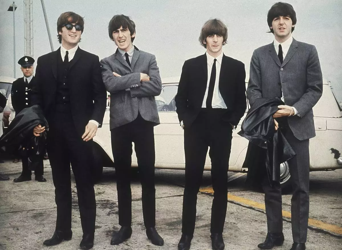 FILE - The Beatles, from left, John Lennon, George Harrison, Ringo Starr and Paul McCartney arrive in Liverpool, England, July 10, 1964. (AP Photo, File)