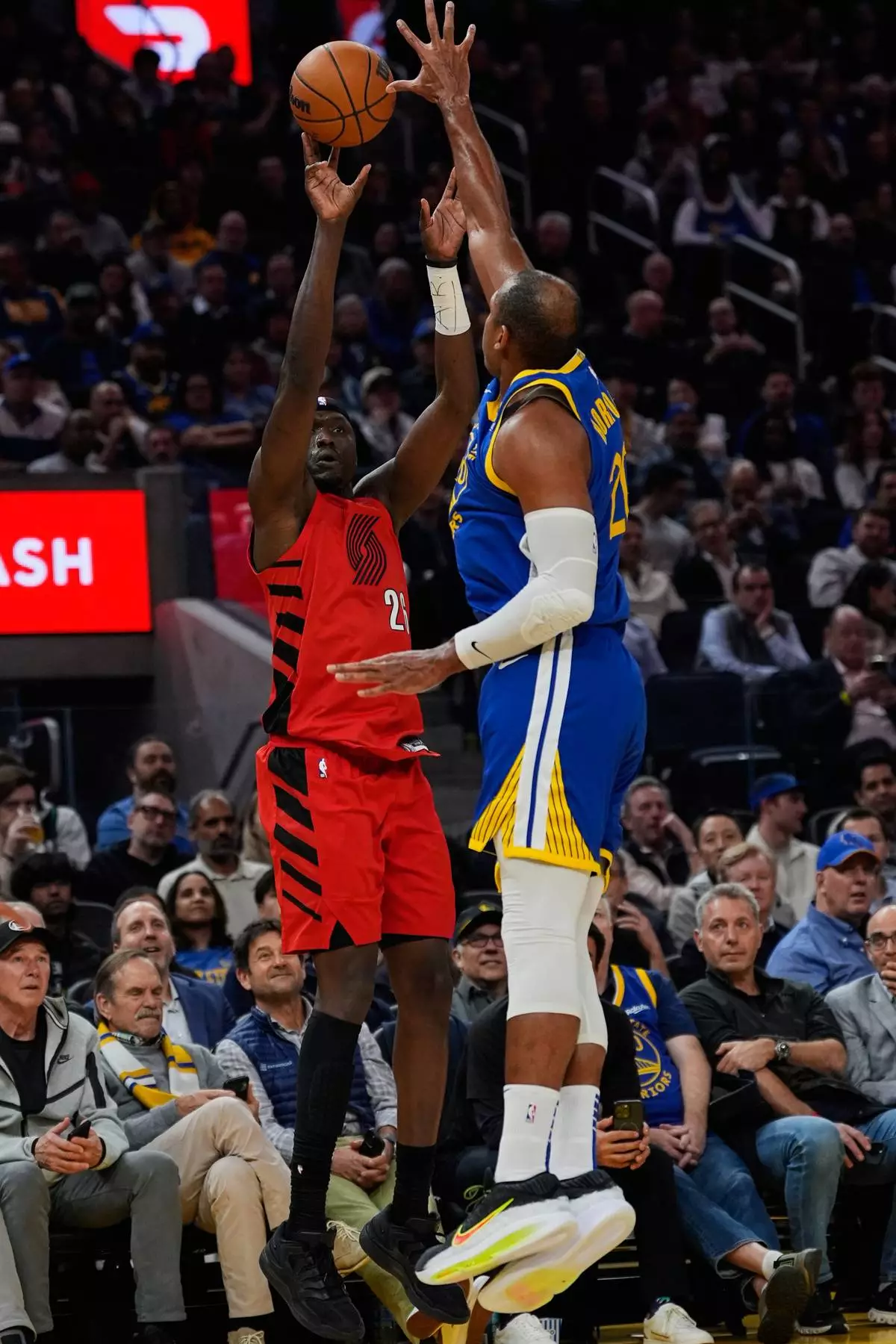 Portland Trail Blazers center Duop Reath (26) shoots a 3-point basket over Golden State Warriors center Al Horford (20) during the first half of an NBA basketball game, Tuesday, Jan. 13, 2026, in San Francisco. (AP Photo/Godofredo A. Vásquez)