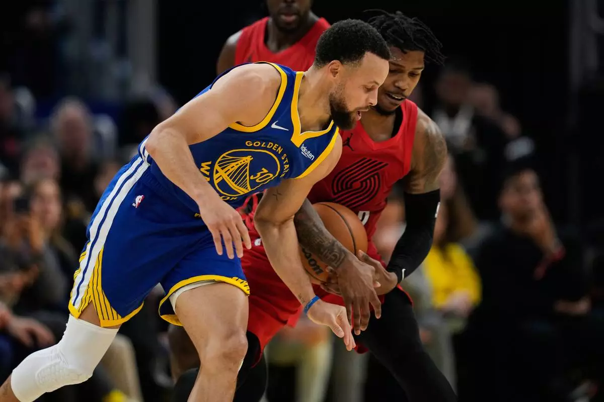 Portland Trail Blazers guard Caleb Love, right, takes the ball away from Golden State Warriors guard Stephen Curry during the first half of an NBA basketball game, Tuesday, Jan. 13, 2026, in San Francisco. (AP Photo/Godofredo A. Vásquez)