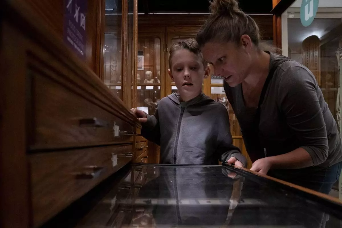 Lincoln Stollenwerk, 8, and Felice Leibowitz, 43, look at a display on objects swallowed by people at the Mütter Museum on Thursday, Aug. 21, 2025, in Philadelphia. (AP Photo/Mingson Lau)