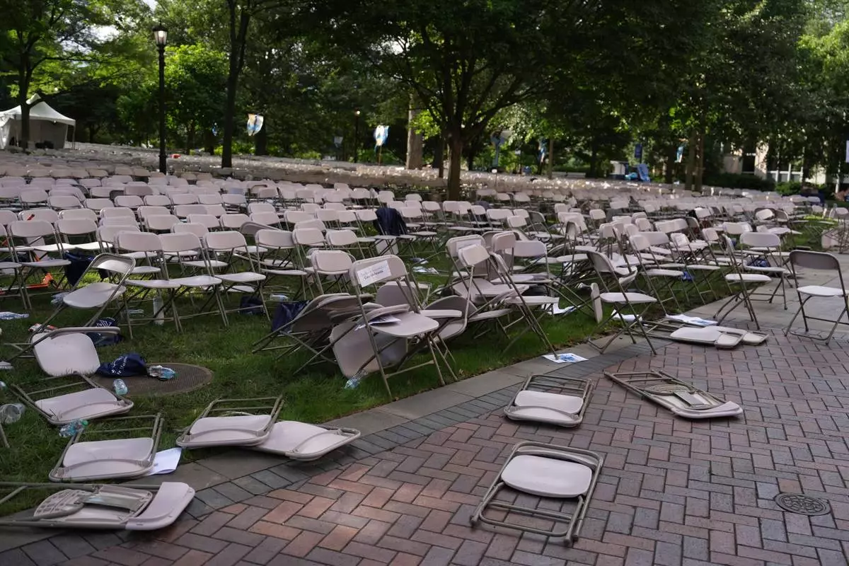 A mess of toppled chairs at the Villanova University campus where an active shooter was reported Thursday, Aug. 21, 2025, in Villanova, Pa. (AP Photo/Matt Slocum)