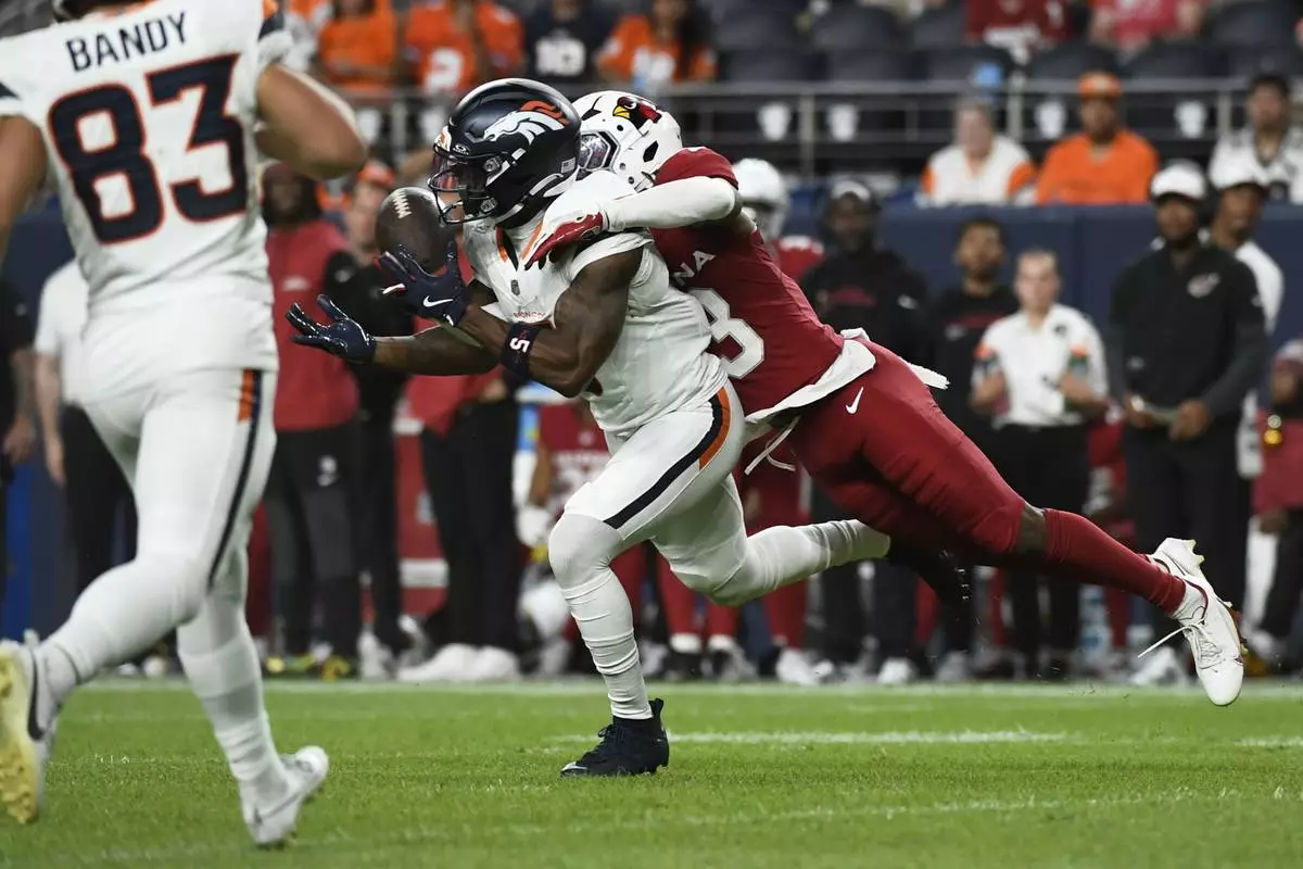 Arizona Cardinals cornerback Kei'Trel Clark, right, hits Denver Broncos wide receiver Trent Sherfield Sr. (5) as he tries to make a catch during the first half of a preseason NFL football game Saturday, Aug. 16, 2025, in Denver. (AP Photo/Eric Lutzens)