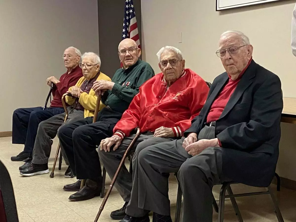 World War II veterans (from left) Orval Legget, Frank Smith, Keith Goman, Donald McPherson and Donavan Diller received 80 Years of Victory medals Friday at the Veterans Club. (Christina Lyons/Beatrice Daily Sun via AP)