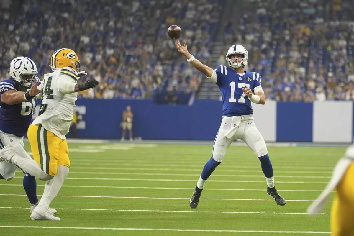 Indianapolis Colts quarterback Daniel Jones (17) throws during the first half of a preseason NFL football game against the Green Bay Packers, Saturday, Aug. 16, 2025, in Indianapolis. (AP Photo/Michael Conroy)