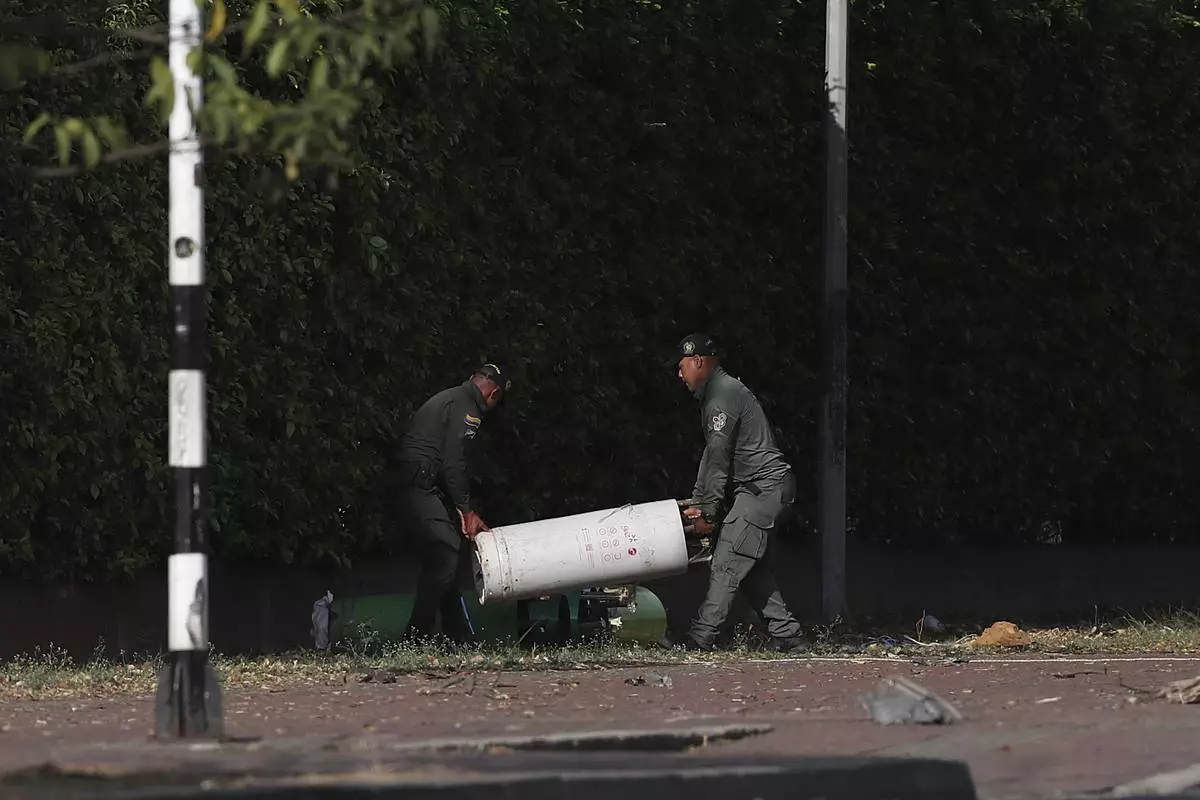 Security forces inspect the site of a bomb explosion outside an Air Force base in Cali, Colombia, Thursday, Aug. 21, 2025. (AP Photo/Santiago Saldarriaga)