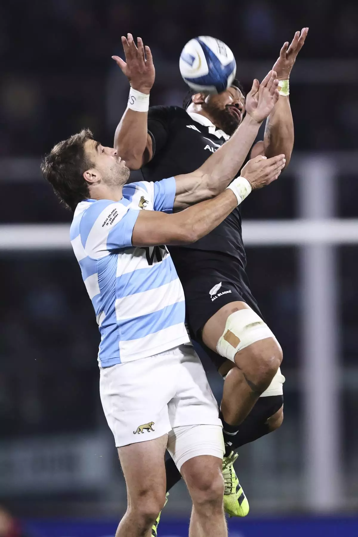 New Zealand's All Blacks Ardie Savea, right, and Argentina's Los Pumas Juan Cruz Mallia battle for the ball during a rugby championship match at Mario Alberto Kempes stadium in Cordoba, Argentina, Saturday, Aug. 16, 2025. (AP Photo/Nicolas Aguilera)