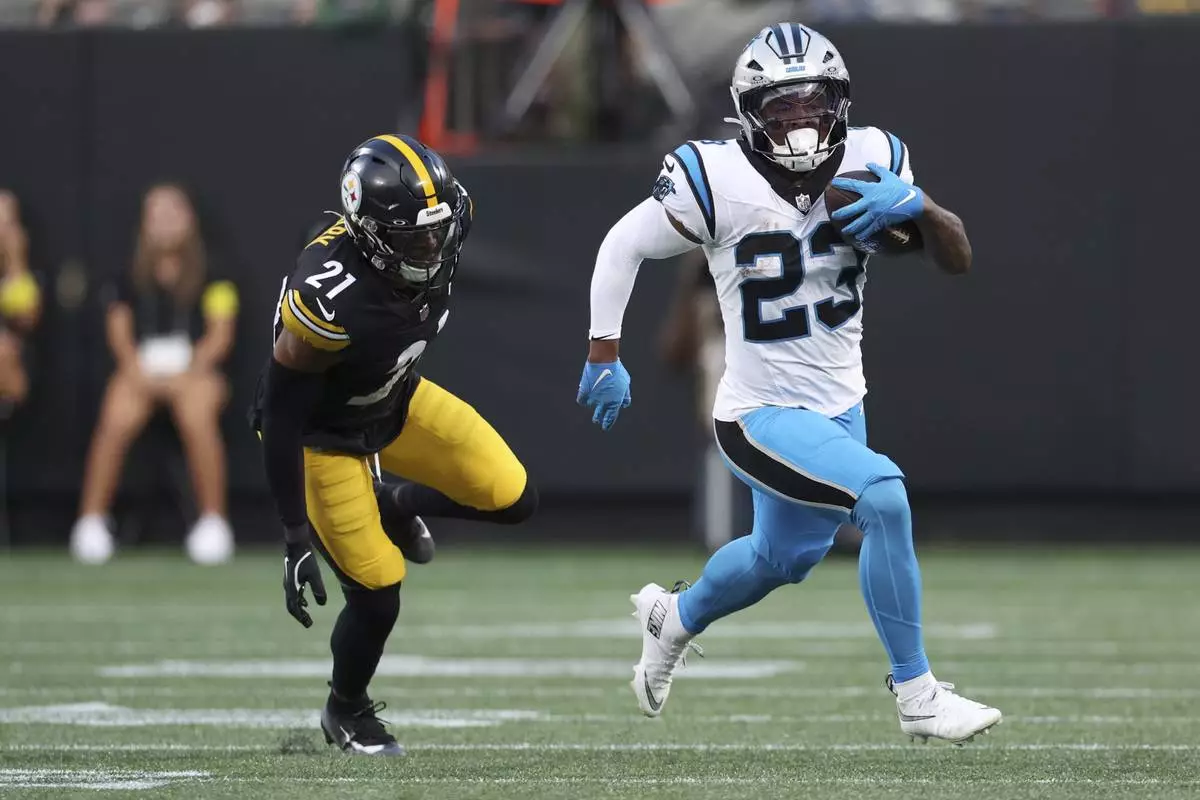 Carolina Panthers running back Trevor Etienne runs past Pittsburgh Steelers safety Chuck Clark during the first half of an NFL preseason football game, Thursday, Aug. 21, 2025, in Charlotte, N.C. (AP Photo/Scott Kinser)