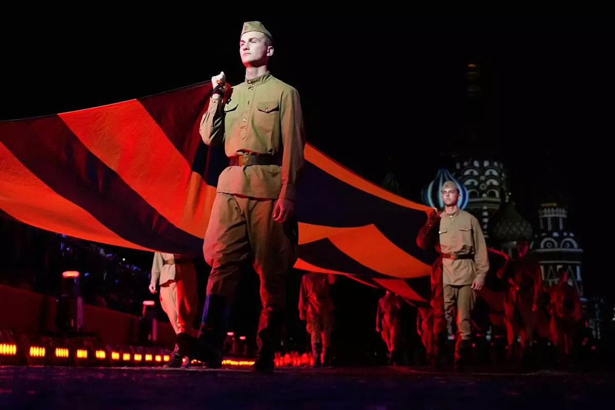 Russian soldiers carry a giant St. George ribbon, a symbol of Soviet participation in World War II, during the Spasskaya Tower International Military Music Festival in Red Square in front of the St. Basil Cathedral in Moscow, Russia, on Thursday, Aug. 21, 2025. (AP Photo/Alexander Zemlianichenko)