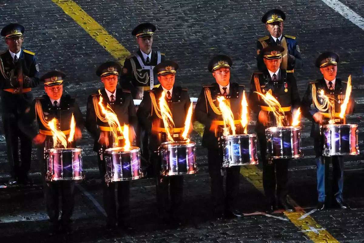 The Central Band of the National Military-Patriotic Center of the Republic of Kazakhstan perform during the closing ceremony of the Spasskaya Tower International Military Music Festival in Red Square in front of the St. Basil Cathedral in Moscow, Russia, on Sunday, Aug. 31, 2025. (AP Photo/Alexander Zemlianichenko)