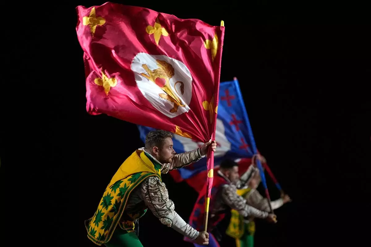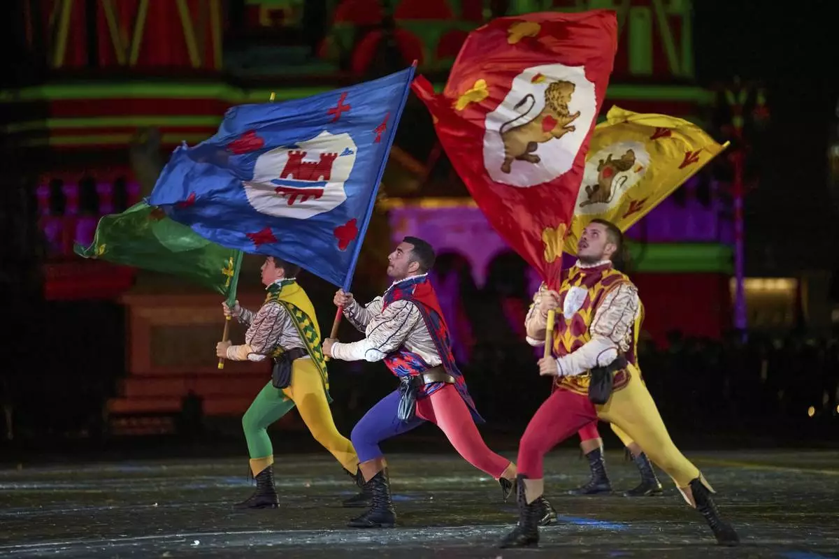Members of the historic Flag-wavers of the Contrade of Cori, Italy perform during the closing ceremony of the Spasskaya Tower International Military Music Festival in Red Square in front of the St. Basil Cathedral in Moscow, Russia, on Sunday, Aug. 31, 2025. (AP Photo/Alexander Zemlianichenko)
