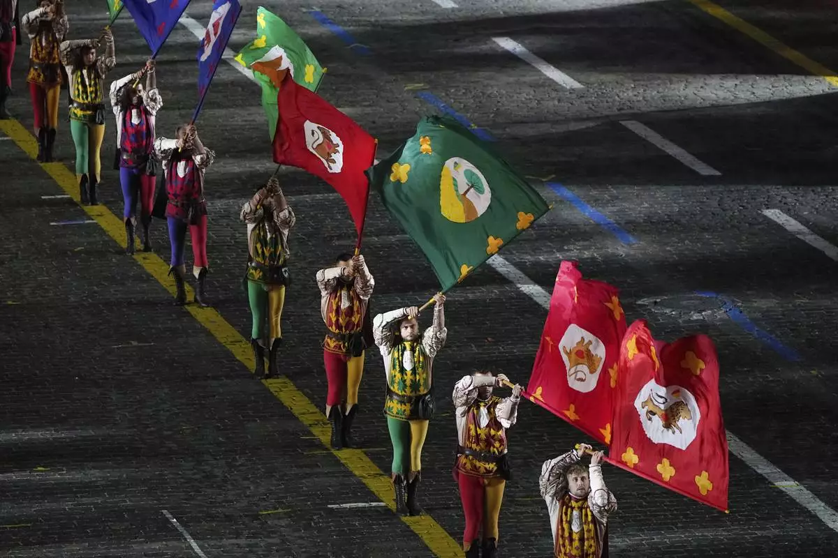 Members of an Italian group Historicl Flag Wavers of the Contrade of Cori perform during a dress rehearsal of the Spasskaya Tower International Military Music Festival on the Red square in Moscow, Thursday, Aug. 21, 2025. (AP Photo/Alexander Zemlianichenko)