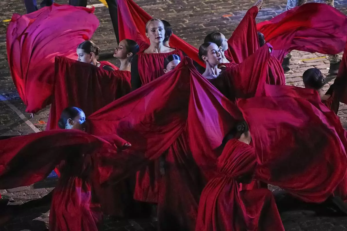Actors perform during a dress rehearsal of the Spasskaya Tower International Military Music Festival in Red Square in front of the St. Basil Cathedral and the Spasskaya Tower in Moscow, Russia, Thursday, Aug. 21, 2025. (AP Photo/Alexander Zemlianichenko)