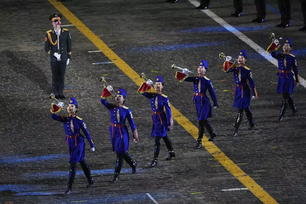 Members of the Mongolian Military Song and Dance Ensemble perform during the closing ceremony of the Spasskaya Tower International Military Music Festival in Red Square in front of the St. Basil Cathedral in Moscow, Russia, on Sunday, Aug. 31, 2025. (AP Photo/Alexander Zemlianichenko)