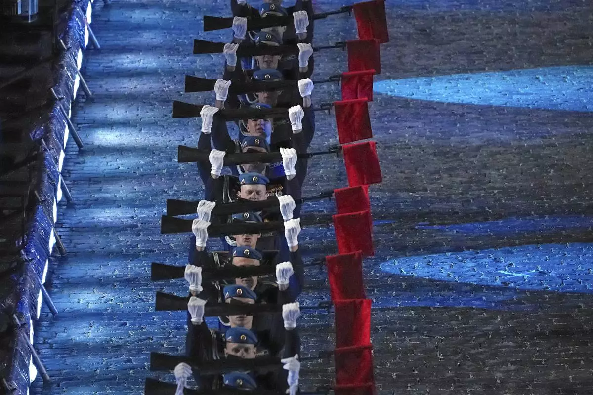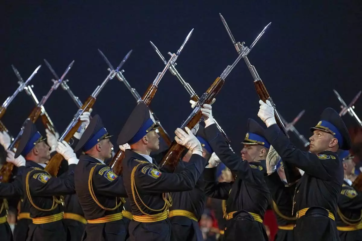 The Honor Guard of the Presidential Regiment of the Moscow Kremlin Commandant's Service of the Federal Guard Service of the Russian Federation perform during the closing ceremony of the Spasskaya Tower International Military Music Festival in Red Square in front of the St. Basil Cathedral in Moscow, Russia, on Sunday, Aug. 31, 2025. (AP Photo/Alexander Zemlianichenko)