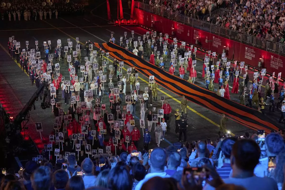 Russian soldiers carry a giant St. George ribbon, a symbol of Soviet participation in World War II and portraits of fallen soldiers, during the closing ceremony of the Spasskaya Tower International Military Music Festival in Red Square in front of the St. Basil Cathedral in Moscow, Russia, on Sunday, Aug. 31, 2025. (AP Photo/Alexander Zemlianichenko)
