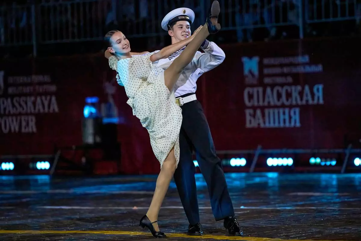 Actors in 1950s clothing perform during the closing ceremony of the Spasskaya Tower International Military Music Festival in Red Square in front of the St. Basil Cathedral in Moscow, Russia, on Sunday, Aug. 31, 2025. (AP Photo/Alexander Zemlianichenko)