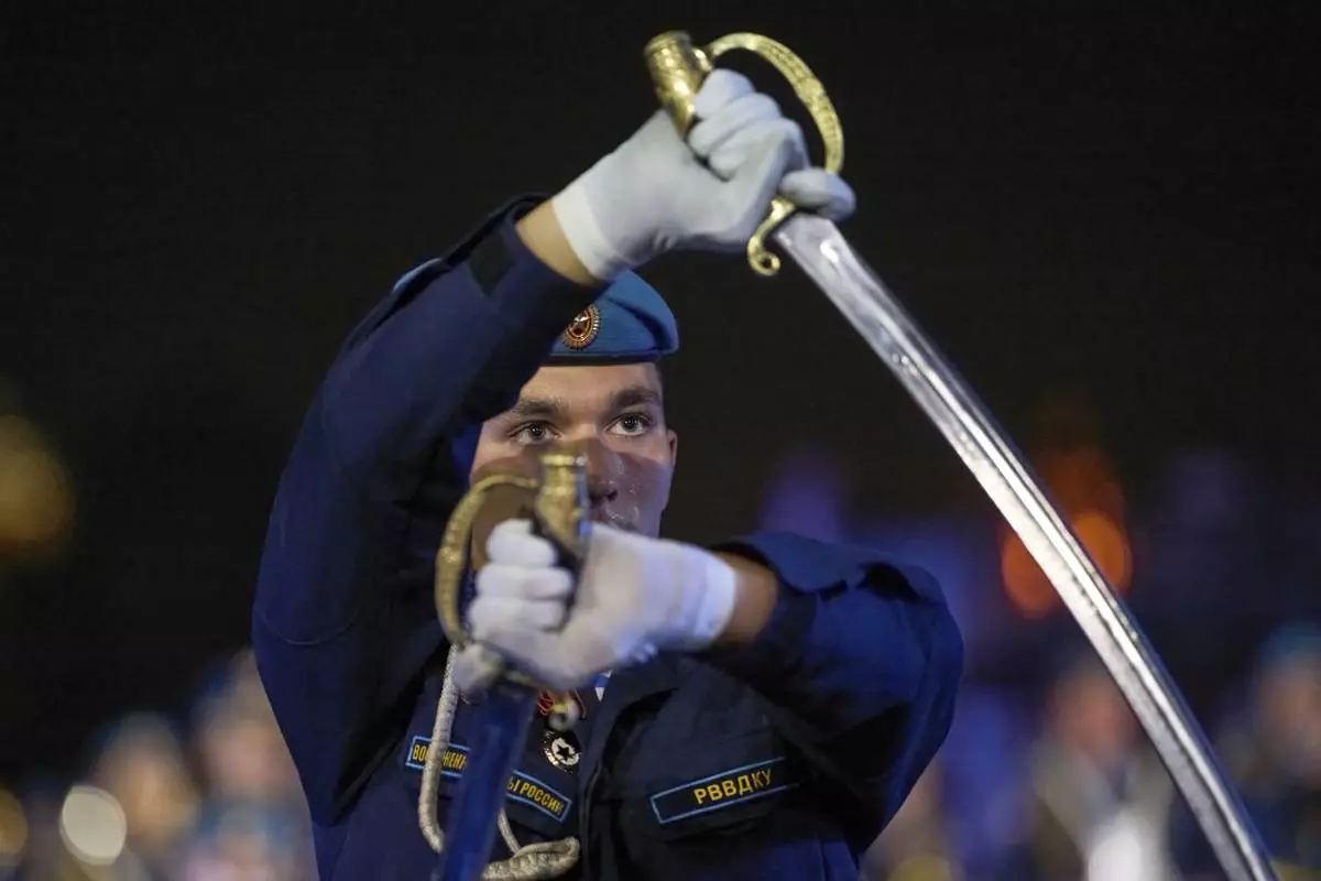 Members of The Honor Guard of the Russian Presidential Regiment perform during a dress rehearsal of the Spasskaya Tower International Military Music Festival on the Red Square in Moscow, Russia, Thursday, Aug. 21, 2025. (AP Photo/Pavel Bednyakov)