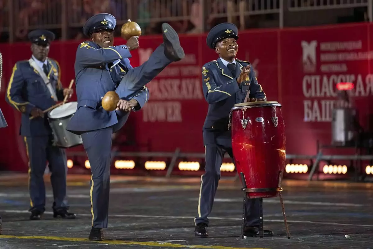 Members of the Zimbabwe Defense Forces Band perform during a dress rehearsal of the Spasskaya Tower International Military Music Festival on the Red square in Moscow, Thursday, Aug. 21, 2025. (AP Photo/Pavel Bednyakov)
