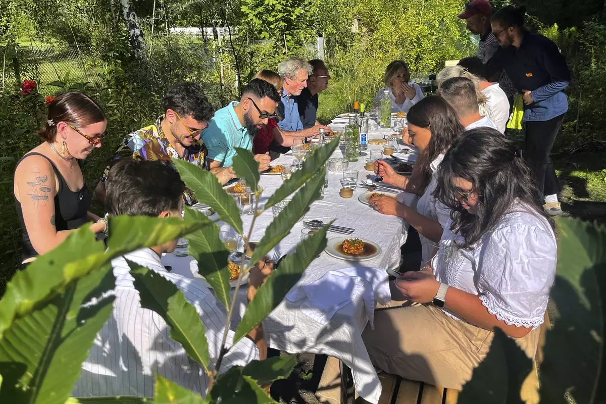 Visitors attend a joint meal at Martin Roetzel's 'The Monk Garden' in Berlin, Germany, Sunday, Aug. 17, 2025. (AP Photo/Fanny Brodersen)