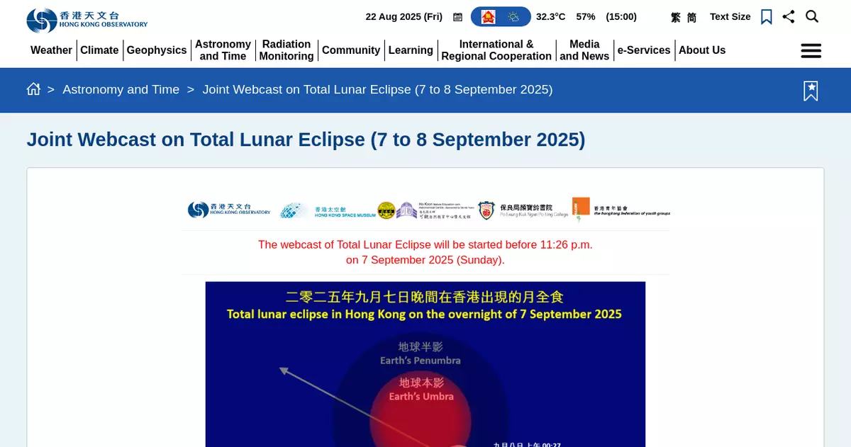 On the late night of September 7 to the early hours of September 8, members of the public can watch the whole event via a webcast webpage, jointly hosted by the Hong Kong Observatory, the Hong Kong Space Museum, the Ho Koon Nature Education cum Astronomical Centre (sponsored by Sik Sik Yuen), the Po Leung Kuk Ngan Po Ling College and the Creative Education Unit of the Hong Kong Federation of Youth Groups.