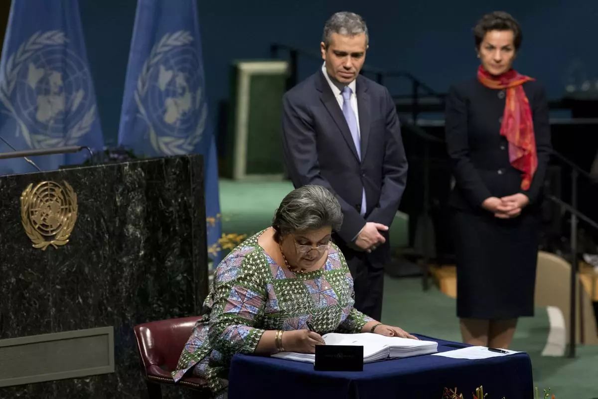 FILE -Foreign Minister of Ghana Hanna Tetteh signs the Paris Agreement on climate change, April 22, 2016 at U.N. headquarters. (AP Photo/Mary Altaffer, File)