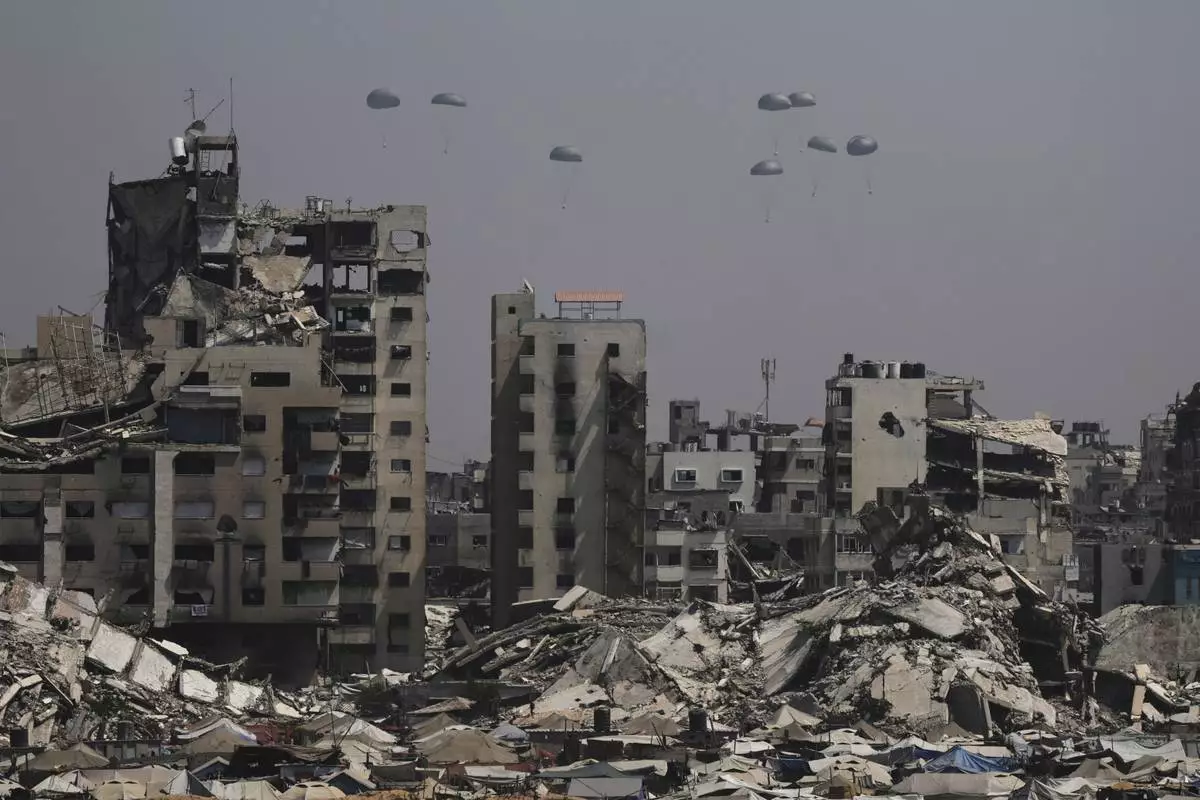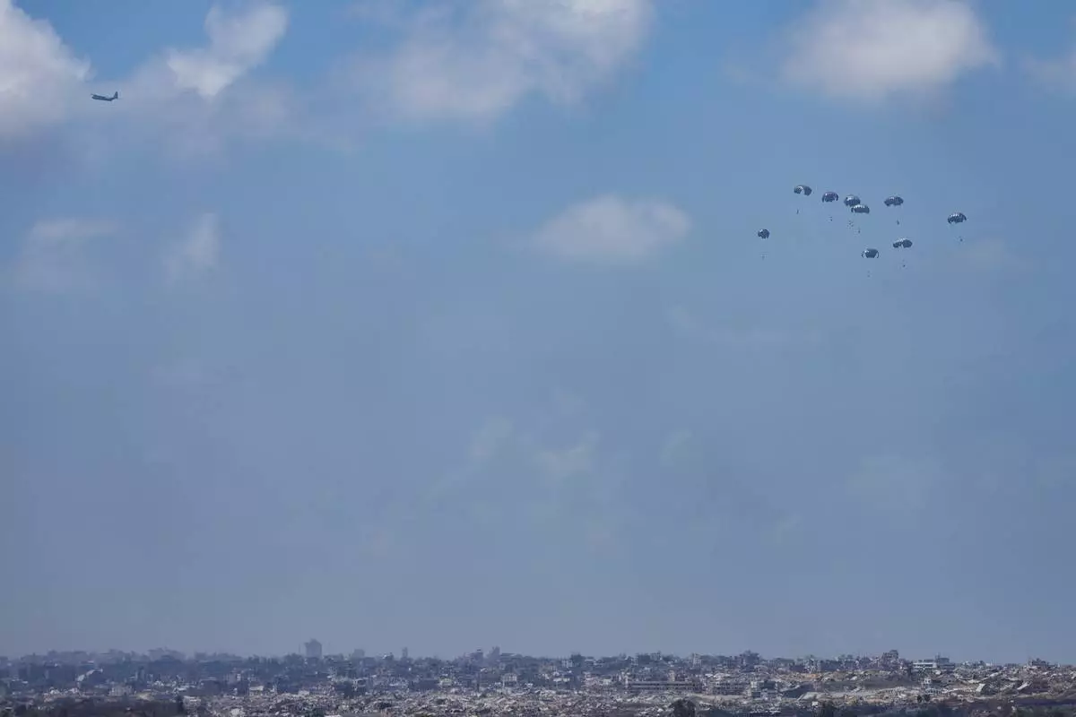 Humanitarian aid is airdropped over Gaza City, Gaza Strip, July 28, 2025. (AP Photo/Jehad Alshrafi)